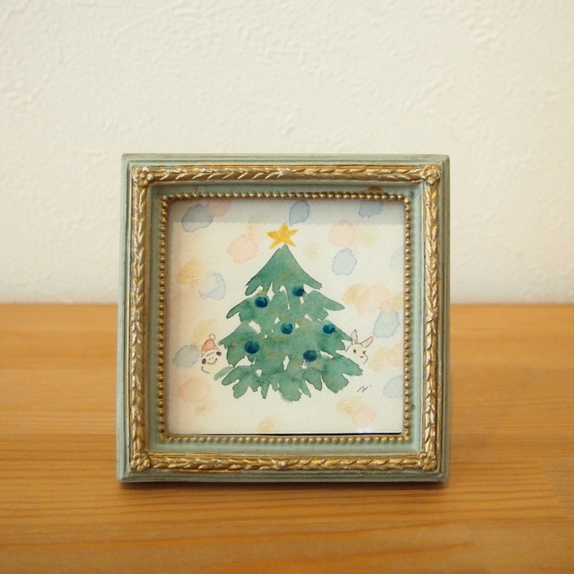 水彩イラスト原画「クリスマスツリーからぴょっこり」